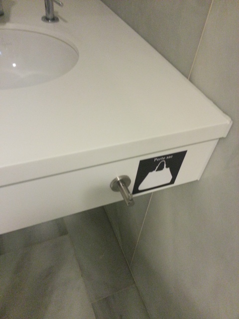 Enfin, je vous laisse admirer les toilettes pour femmes, avec leur espace maquillage, des porte-sacs… et des porte-parapluies.