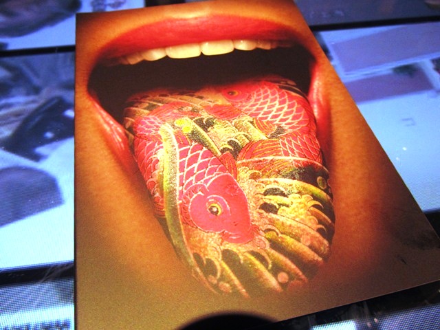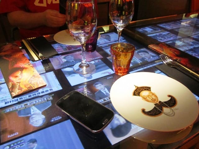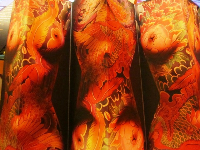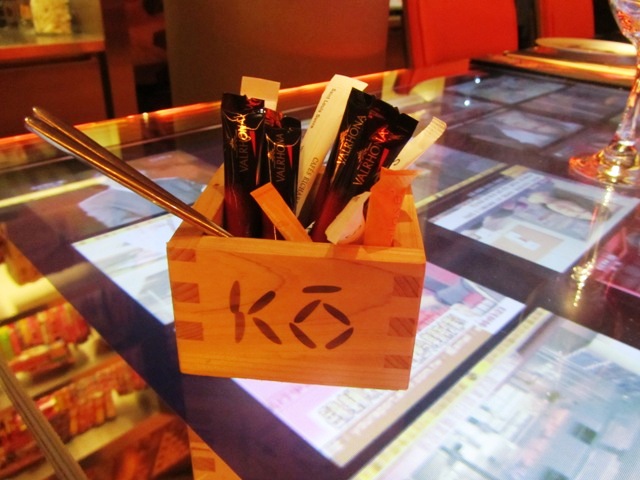 A commencer par la vue. Avec un décor signé Philippe Starck (les lecteurs de ce blog connaissent ma faiblesse pour les lieux qui portent sa touche, du Mama Shelter à Ma Cocotte), l’œil ne peut s’empêcher de partir à la recherche des mille et un détails qui le compose. Mélange de design et d’objets typiquement asiatiques, le concept est moderne et insolite. Et comment ne pas être impressionné par le corps tatoué de Miss Kô, la femme sans visage qui donne son nom au restaurant.