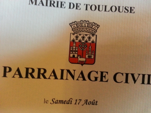 Pour en revenir à la cérémonie du 17 août dernier, elle s’est déroulée de manière très simple. Après une bonne heure de retard (il y avait du retard dans la célébration des mariages ce jour-là, et les mariages sont prioritaires sur les parrainages civils), un adjoint au maire nous a rejoint. Il nous a dressé un petit historique sur la Mairie de Toulouse (plus particulièrement de la salle Gervais où nous nous trouvions). Puis il a procédé à la lecture du certificat….