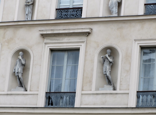 D’après mes recherches, le 3 rue Soufflot (75005) date de la période de la Restauration. On observe des niches, rondes ou en arc en plein cintre, décorées par des visages ou des personnages sculptés en pied.