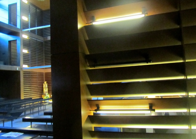 L’intérieur est tout aussi inattendu, mais j’ai trouvé ce lieu de culte harmonieux et propice au recueillement.