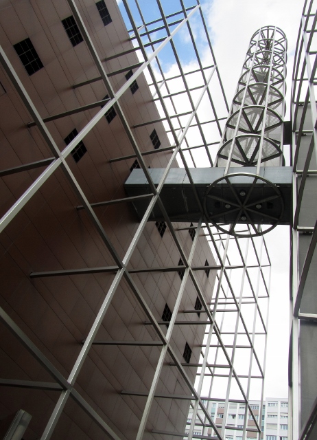 Conçue par le cabinet Architecture-Studio en 1986 (…), l’église prend la forme d’un cube de 18 mètres de côté, entouré d’une résille métallique. Ses dimensions égales (longueur, largeur et hauteur) entendent symboliser la Jérusalem céleste (Livre de l’Apocalypse, chapitre 21). Ce cube est lui-même supporté par 12 colonnes – à l’image des 12 apôtres – en surplomb du jardin public d’Alleray-Procession dans lequel il est construit et qui soutiennent une église « sur pilotis ». Source : Wikipedia.