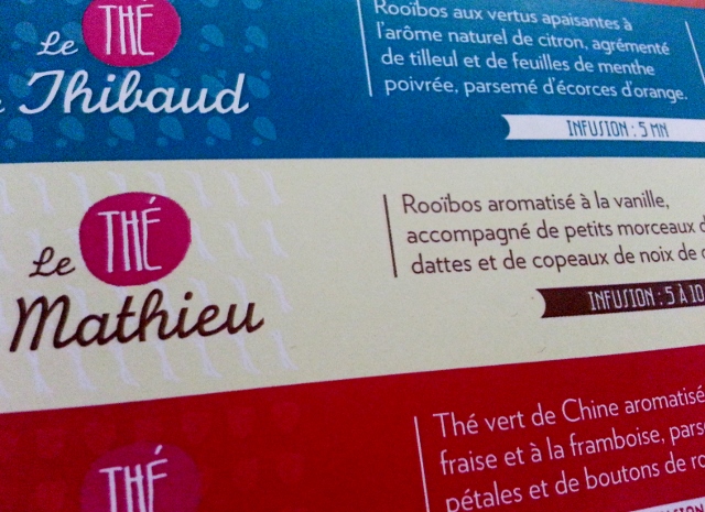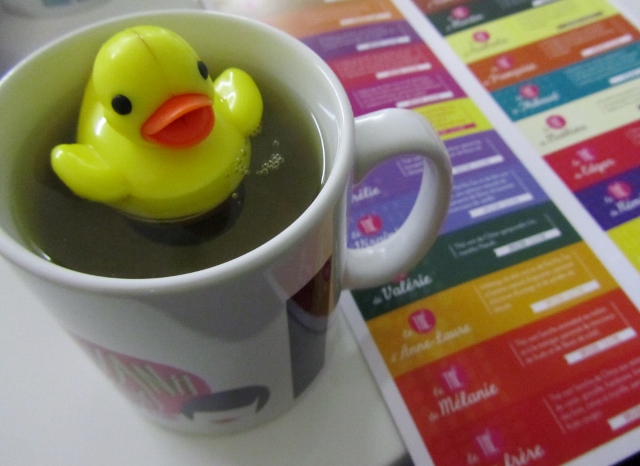 Qu’est-ce qu’on boit ? Des thés et cafés bio et éthiques, des jus de fruits. J’ai savouré deux excellents thés : Mathieu et Xavier (les thés portent les prénoms de toutes les personnes qui ont aidé la propriétaire à lancer son projet). Et la note girly que j’ai adorée : les petits canards à infuser…