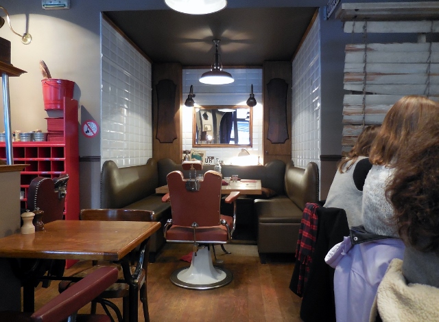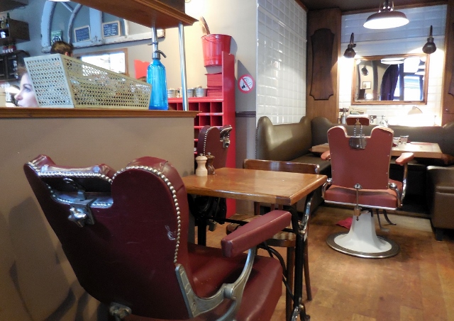 A quoi ça ressemble ? A un salon de barbier, avec ses tables, ses chaises, un éclairage tamisé de lampes industrielles, du parquet, de la céramique et des fauteuils de barbier… Le cadre est cosy et totalement vintage.