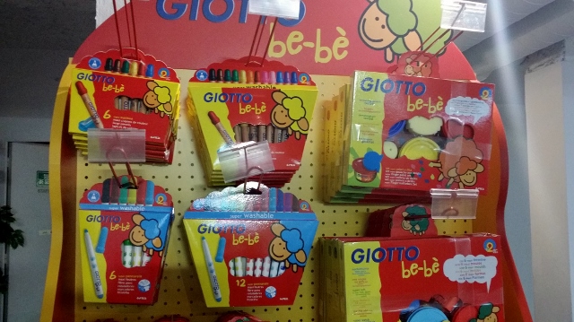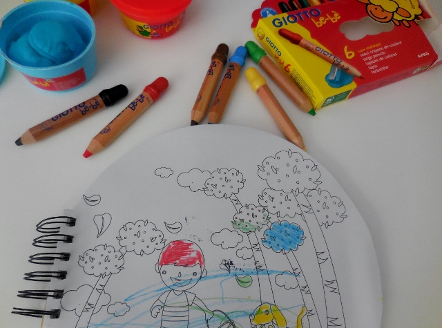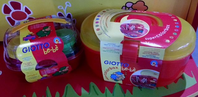 Jusqu’à présent, Petit Ange dessinait avec des crayons de couleur m’appartenant. Je ne pas jugeais pas nécessaire de lui acheter des crayons pour enfant, car je ne percevais pas quelle pouvait être la pertinence à utiliser des produits spécifiques sur ce type d’équipement. En effet, même l’argument “lavables facilement sur les vêtements” ne m’a pas convaincu : un crayon ne tâche pas vraiment (du moins, pas autant qu’un feutre), donc ce risque n’en était pas vraiment un. J’ai changé d’avis depuis que nous avons assisté à la présentation de la collection bébé de la marque italienne Giotto.