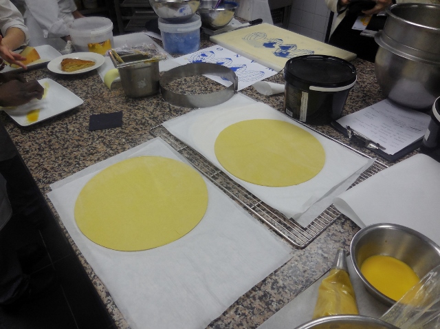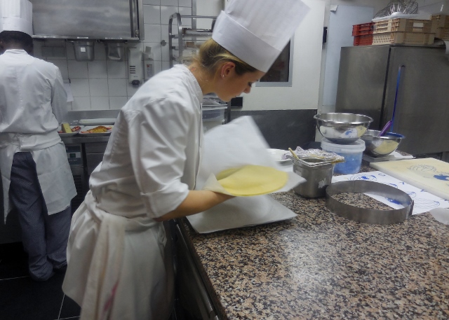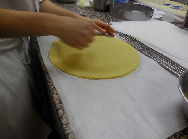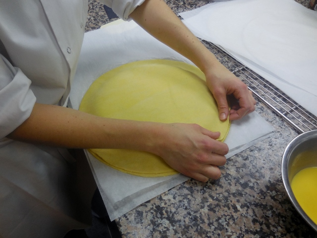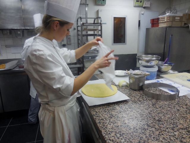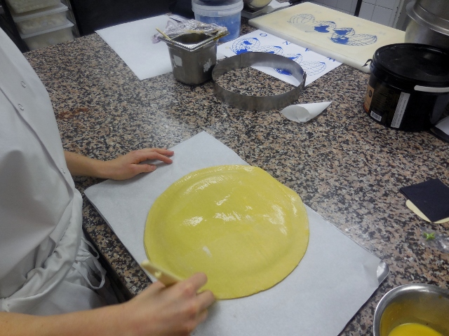 Non contente d’avoir goûté les deux parfums de ces excellentes galettes, j’ai eu la chance d’assister à la conception (au montage pour être plus précise) de l’une de ces petites merveilles. Estelle, orfèvre en pâtisserie, me détaillais chaque étape. Je l’écoutais studieusement, tout en sachant que je serais bien incapable de reproduire ses gestes…