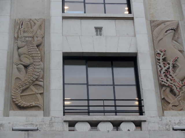 Au second étage, la fenêtre centrale est encadrée par deux bas-reliefs : un chameau à gauche, un éléphant à droite. Au même étage, d’autres bas-reliefs viennent orner les espaces situés entre les fenêtres : crocodile, requin, tigre, serpent… Le quartier Pasquier est riche en histoire et culture.