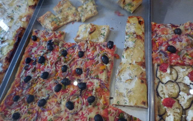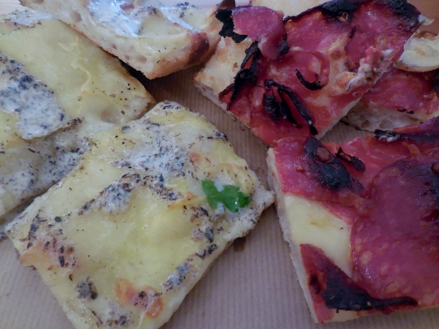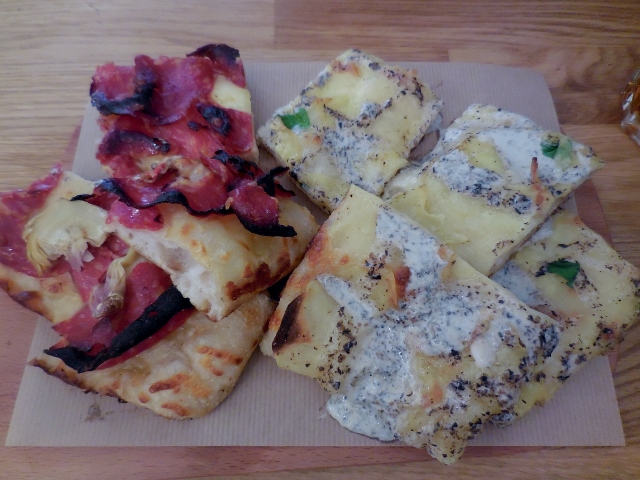 Une fois installés, vous pourrez déguster des parts de pizza à base de produits très frais et variés. L’avantage de la pizza au poids et à la coupe, c’est la possibilité de goûter à tout selon ses goûts et ses envies. Dans un autre registre, cela me rappelle le concept A l’Unithé, grâce auquel on peut mélanger des sachets de thés différents à chaque commande, histoire de changer de parfum en fonction de son humeur. J’adore cette liberté. Pour ceux qui veulent garder le contrôle sur l’addition, Al Taglio propose également des formules le midi. Je n’ai pas pris de dessert, mais ils avaient l’air extrêmement bons…