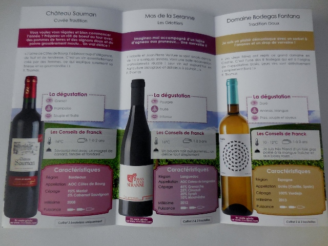 En fonction de la formule d’abonnement choisie, vous recevez chaque mois un colis composé de deux ou trois bouteilles de vin. La box est accompagnée d’un petit guide extrêmement précieux, qui contient un descriptif de chaque vin (région, appellation, cépage, millésime, robe…), des conseils de conservation optimale, et des conseils de dégustation. Et puis surtout, on retrouve l’avis de Franck Thomas, meilleur sommelier de France et d’Europe 2000, qui se charge de sélectionner les vins.