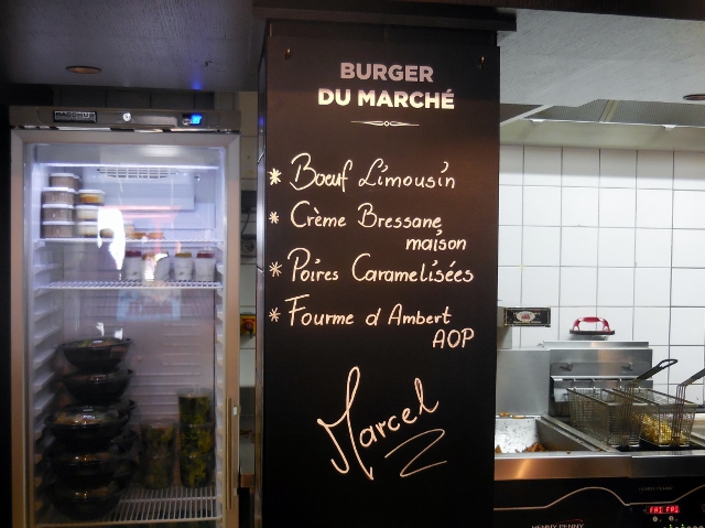 Quant à l’assiette (pardon, au plateau), le terroir est à l’honneur : buns, viandes et fromages français, burger, frites et ketchup maison… Les produits sont frais et préparés sous vos yeux. Ainsi, vous dégusterez votre Marcel Michelin (un burger au Saint Nectaire AOP, lard grillé et crème de moutarde maison) avec un verre de Syrah… Le Burger du Marché change tous les quinze jours en fonction des saisons.