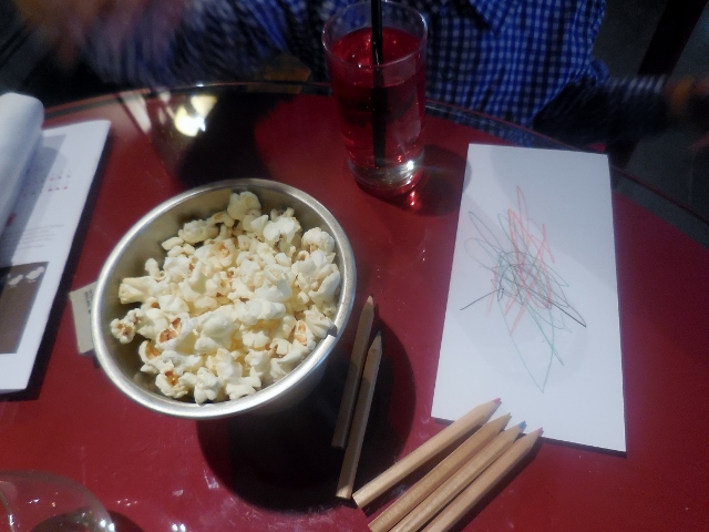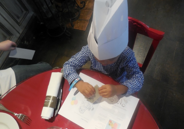 J’ai ensuite accompagné mon fils dans le superbe espace dédié aux petits. La jeune femme chargée d’animer la séance était déjà sur place et préparait les fournitures pour l’atelier du jour. Elle a gentiment installé mon fils, lui a proposé une feuille pour patienter en dessinant, puis m’a expliquée comment la séance allait se dérouler. Une fois le dessin terminé, nous retournés à table pour déjeuner. Nous avons trouvé l’attente assez longue, aussi Mon Lutin a dévoré son plat pour retourner au plus vite à son atelier. Pour la première fois, Mon Héros et moi n’avons pas eu à nous relayer pour le surveiller : il n’était pas livré à lui-même, sans surveillance au milieu d’une horde d’enfants, mais pris en charge pour un atelier créatif au sein d’un petit groupe. Et cela fait toute la différence. Certes, nous avons jeté une tête une ou deux fois, pour nous assurer qu’il ne faisait pas tourner l’animatrice en bourrique, mais nous sommes restés quelques secondes seulement. Nous avons tranquillement déjeuné à deux, tandis que notre fils était très occupé.