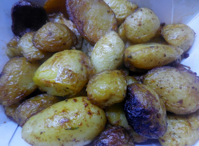 Les pommes de terre rôties, cuites dans la graisse du poulet, se mangent sans faim : fondantes et délicieusement assaisonnées, on pourrait les picorer sans accompagnement.