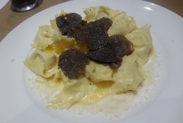Ainsi conseillés, nous avons choisi les spécialités de la maison : oeuf poché et linguine pour moi ; culatello grana (jambon et fromage grana) et Tortelli à la truffe pour Mon Héros. Vous noterez que la truffe est très présente à la carte. Ce produit est toujours de saison, car il existe de nombreuses variétés de truffes, si bien que l’on en trouve toute l’année.