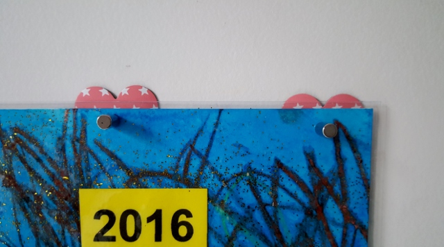 Comme je devais également accrocher le calendrier 2016 que Mon Lutin a réalisé à l’école, j’ai préféré utiliser les pastilles décoratives, au lieu du second ruban (je m’en servirai plus tard pour d’autres photos). Le principe d’installation est identique, si ce n’est que l’on ne pose qu’un point de colle par pastille.