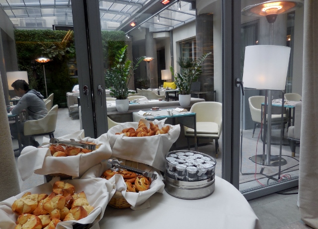 Tous les dimanches, un brunch 100% bio est servi de 11h30 à 15h30 (75 € par adulte / 29 € par enfant de moins de 10 ans). J’en entendais parler très régulièrement et ces éloges sont largement mérités. La qualité des mets est aussi bonne qu’elle paraît, et la fraîcheur des produits remarquable. Des plats superbes sont présentés en libre-service : d’abord les plats froids (fruits de mer, salades, fromages, charcuteries), puis les plats chauds (autour de la viande et du poisson, ils sont servis en mini-portions de type « bouchées », ce qui permet d’en goûter plusieurs et surtout d’éviter de trop manger), et enfin les desserts (là encore, des mini-portions gourmandes). Boissons chaudes et jus de fruits sont inclus dans le tarif, de même que les œufs qui sont préparés à la commande en fonction des envies de chacun.